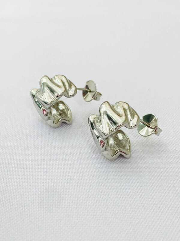 Argola, em ródio branco com desing de linhas curvadas por toda peça, pino superior.